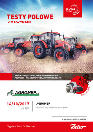 Zapraszamy na kolejny Zetor Tractor Show 2017, tym razem z firmą KUNERT z Poladowa. W dniu 13/10/2017 w piątek w miejscowości RACOT koło Kościana w Wielkopolsce. W pokazach wezmą udział ciągniki marki ZETOR z maszynami Pottinger. Zaczynamy już o godzinie 11.30 !